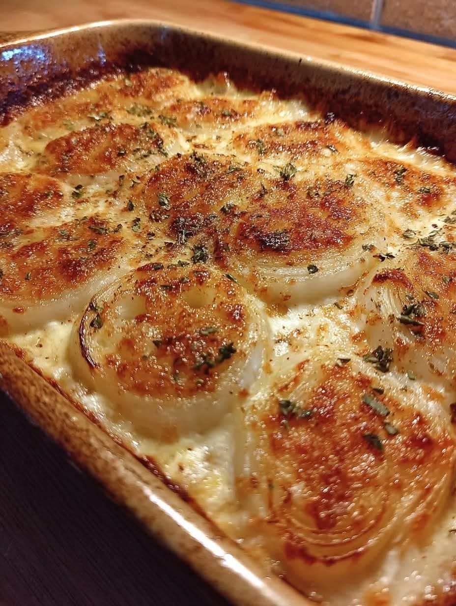 Slowly pour the cream mixture over the onions and sprinkle with the parmesan cheese